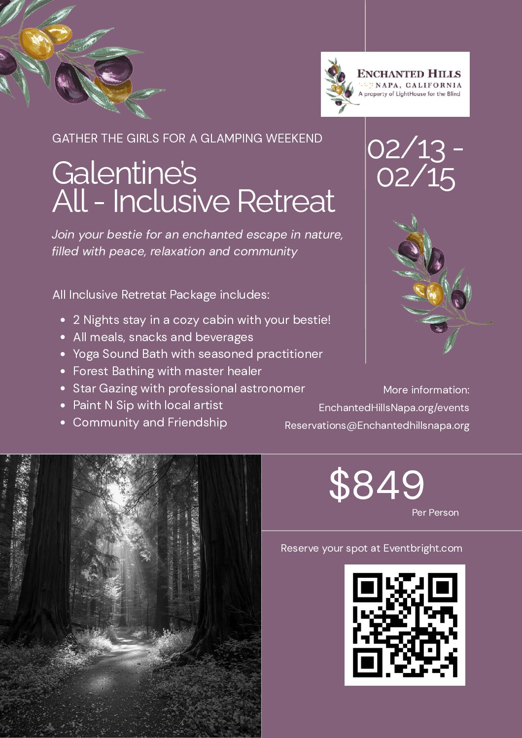 Gather your best friends for an unforgettable weekend escape in nature! The Galentine’s All-Inclusive Retreat at Enchanted Hills Napa offers a unique blend of relaxation, community, and adventure. Enjoy a cozy two-night stay in a cabin, all meals and beverages included, and a variety of enriching activities such as yoga sound baths, forest bathing with a master healer, stargazing with a professional astronomer, and a creative Paint N Sip session with a local artist. This retreat is designed to foster peace, connection, and lasting memories.